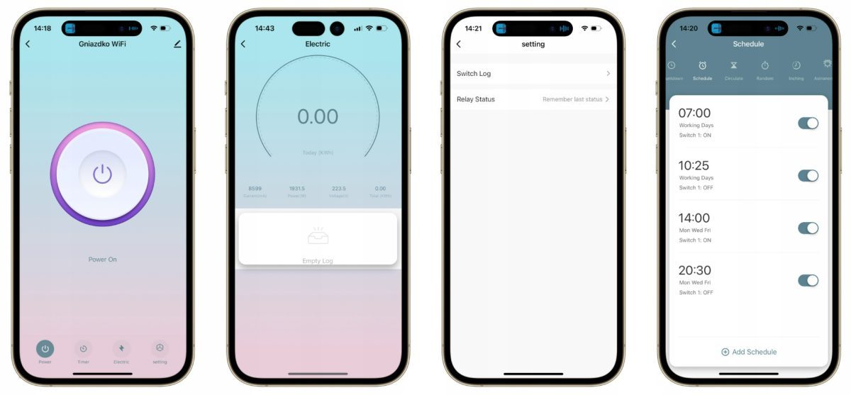 - Zásuvka má kontrolu stavu po výpadku napájení: zapnuto, vypnuto, obnovte stav před ztrátou napájení