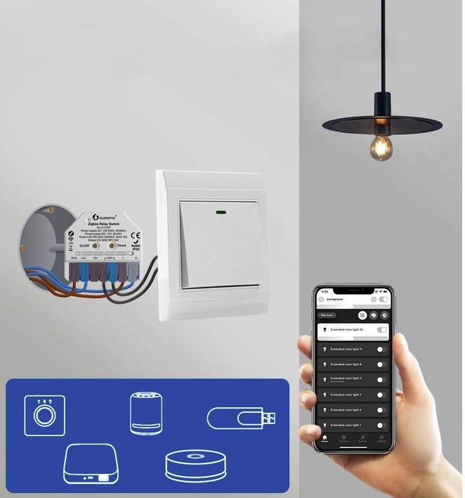 Kromě toho podporuje přímé místní dálkové ovládání pomocí dálkových ovladačů Gledopto 2,4 GHz a nástěnných panelů, místní dálkové ovládání i bez brány Zigbee.