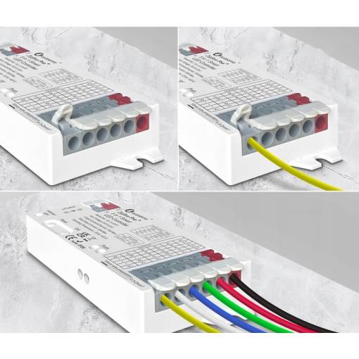 • Připojte napájení (12–24 V) k ovladači a následně výstupy k LED pásku dle počtu kanálů (max. 5in1).