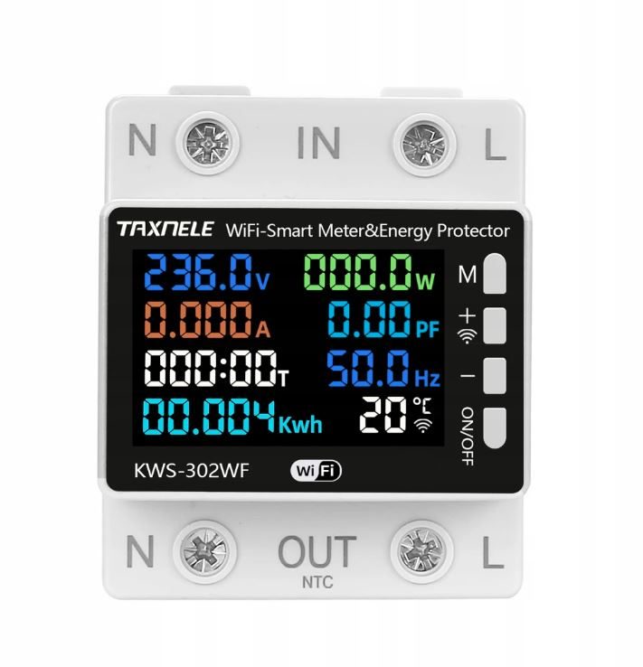 Chytrý spínač s měřením spotřeby elektřiny a možností ovládání přes WiFi. Umožňuje zapínat a vypínat spotřebiče na dálku, sledovat spotřebu energie a nastavit časové plány pro automatické spínání. Barevný displej přehledně zobrazuje napětí, proud, výkon i celkovou spotřebu. Přes mobilní aplikaci lze sledovat historii spotřeby a ovládat zařízení odkudkoliv.
