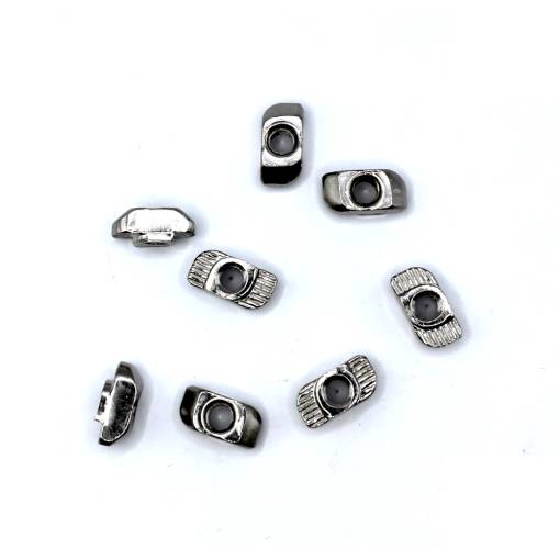 Ocelová matička určená do drážky hliníkových profilů 30x30. Tvar matice umožňuje snadnou montáž i demontáž přímo ze strany profilu, bez nutnosti nasouvání nebo potřeby speciálního klíče. Drážkování na matici bezpečně fixuje pozici utažené matice na zvoleném místě.