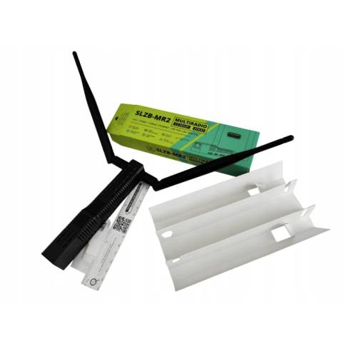 Balení obsahuje: SLZB-MR2 Multirádiová brána, 2x Anténa, šroubovák, 2x montážní šrouby, manuální QR návod, 2x lepící pásky