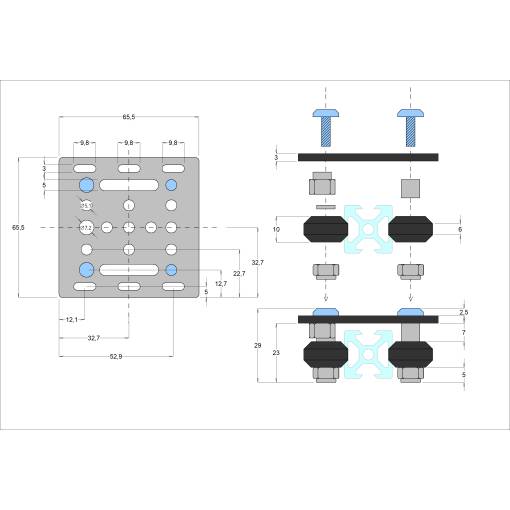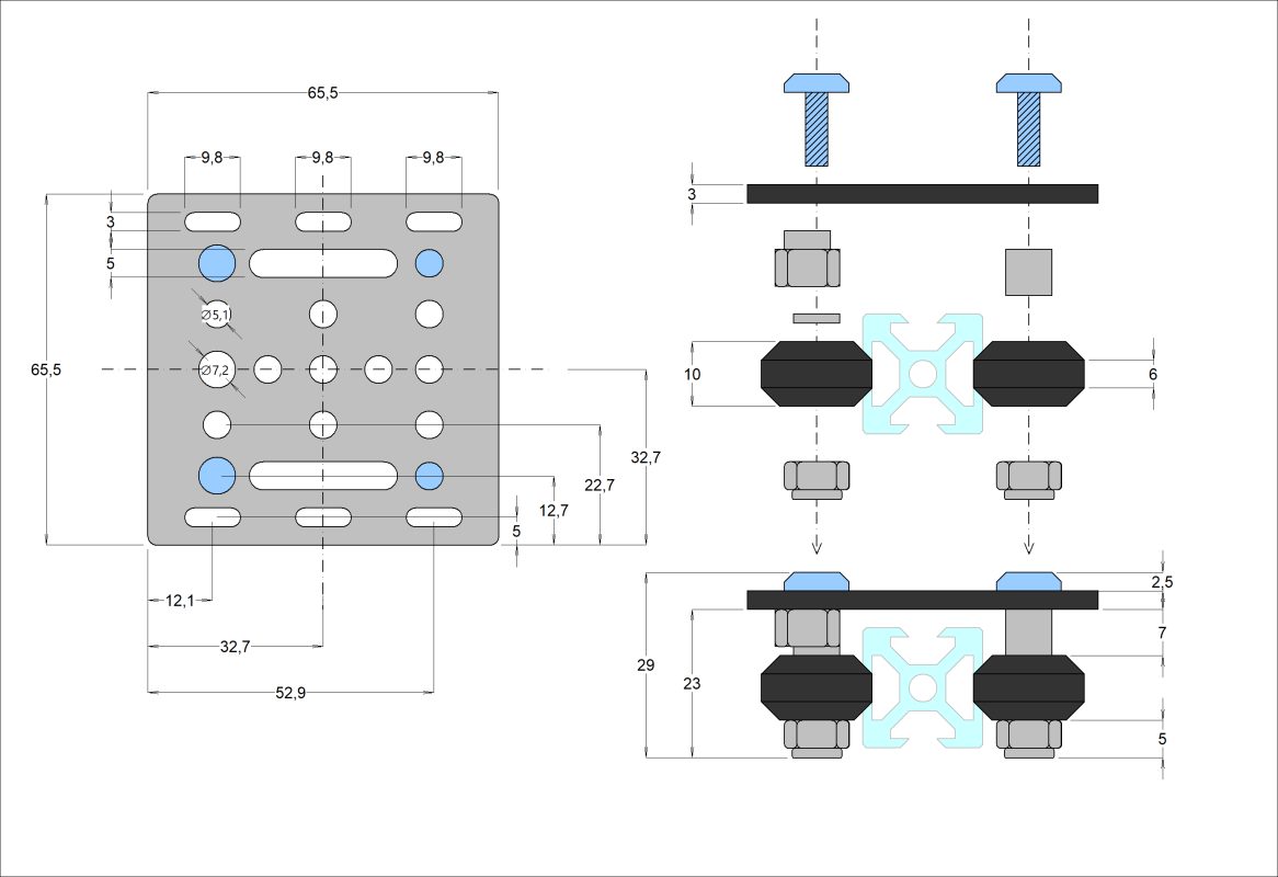 Při montáži postupujte dle výkresu, excentrické šestihranné vložky umožňují volitelný přítlak koleček k hliníkovému profilu. V případě potřeby je možné polohu šroubů a zajišťovacích matic vůči montáži vozíku obrátit (maticí nahoru). Vznikne tak možnost přidělat hliníkový profil 20x20mm přímo na desku nebo stěnu aniž by vozík maticemi o desku drhnul.