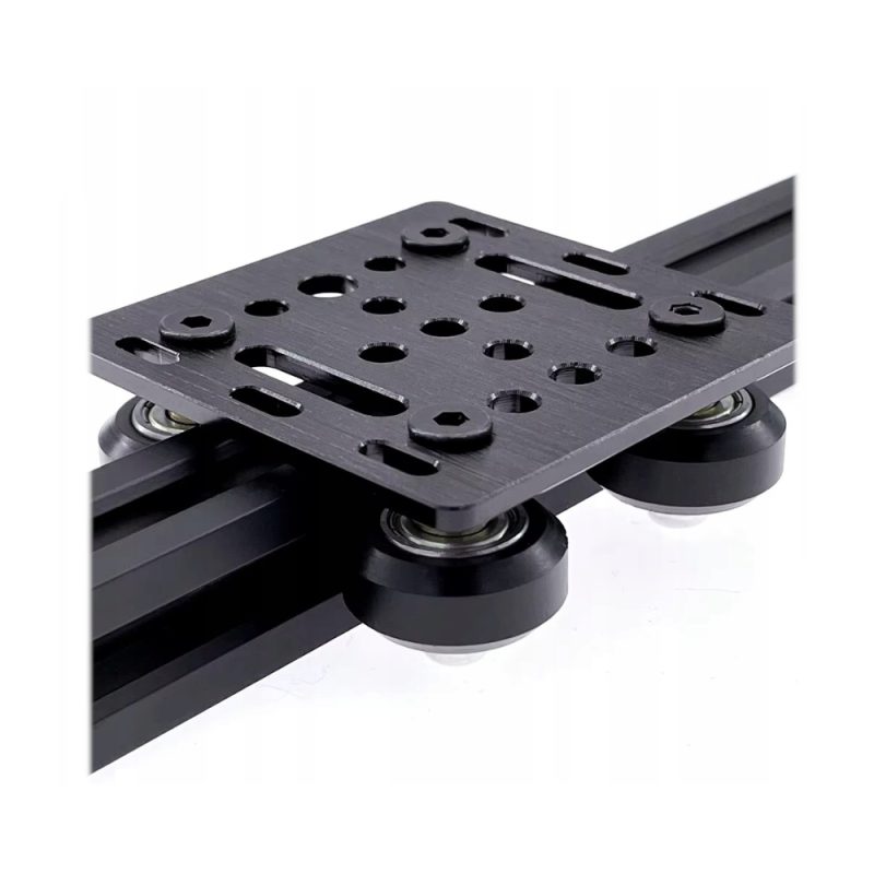 Vozík není omezen délkou, může se pohybovat v jednom směru po profilu tak dalece, jak dlouhý je samotný hliníkový profil. jeho předností je také universální kovová platforma na které vždy najdete otvor pro uchycení další součásti.
