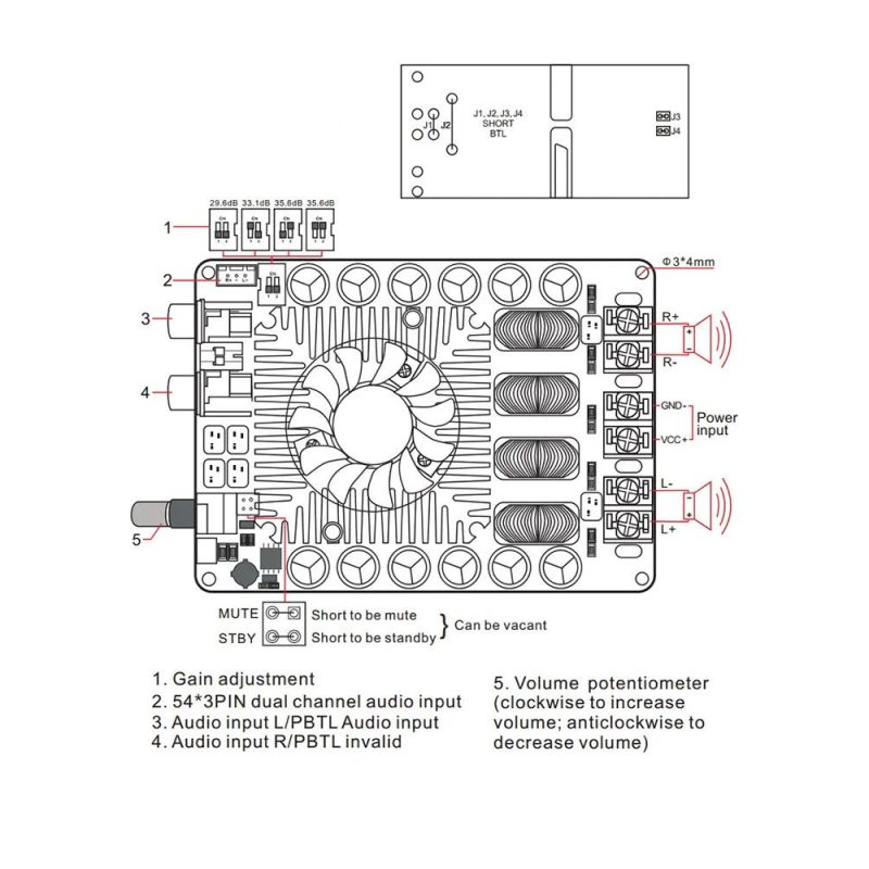 Tento model vyniká svou univerzálností díky podpoře BTL (Bridge-Tied Load) režimu. Zkratováním pájecích bodů J1, J2, J3 a J4 na spodní straně desky lze zesilovač přepnout do mono režimu s výkonem až 220W. Zařízení je kompatibilní s širokou škálou reproduktorů o impedanci 4, 6 nebo 8 ohmů a díky širokému rozsahu napájecího napětí se snadno integruje do různých audio sestav.